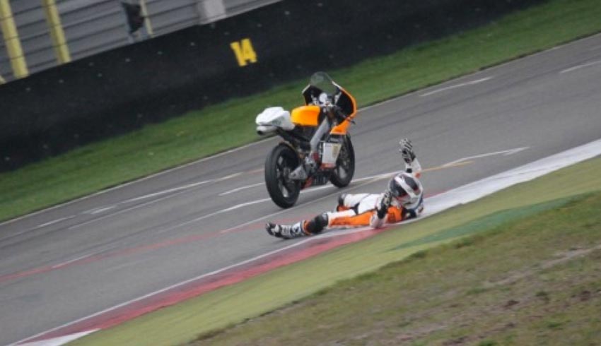 Om half 5 was de start van race 1, op slicks en de baan was droog. Vanaf p4 was mijn start niet slecht. De eerste bocht dook ik dan ook als 4de in. In de Strubben pakte ik iemand, vervolgens in Ruskenhoek kon ik nummer 2 voorbij en met aanremmen voor de Bult kon ik bij Thomas voorbij. Na twee rondes had ik een gat geslagen van 5 seconden en breidde deze uit tot 6,5 seconden. Met nog 6 rondes te gaan begon het te spetteren op de Zuidlus. Bo reed op dat moment p2 en nam veel risico om het gat te dichten. Met nog 3 rondes te gaan begon het overal te regenen en de baan werd nat. Overal vielen er Moriwaki’s (we reden samen met deze juniorklasse). 2 Rondes voor het eind kwam Bo mij voorbij maar direct daarna kon ik er weer voorbij en als leider over de streep komen. Veel coureurs gaven aan dat het te gek werd om op slicks door te rijden, maar er werd geen rode vlag gegeven. Met ingaan van de laatste ronde lag er bijna in iedere bocht wel iemand. In Ruskenhoek (1 van de snellere bochten van het circuit) lagen er zelfs 2. Met aanremmen voor de laatste chicane kwam Bo binnendoor. Ik wist dat ik hem kon hebben op de streep en schakelde terug naar de eerste versnelling, om vervolgens met het juiste toerental de chicane uit te komen. Op het moment dat ik de bocht uit kom kreeg ik een highsider met als gevolg dat de motor doorreedd (de finish nog wel haalde) en ten slotte vol op de muur klapte…